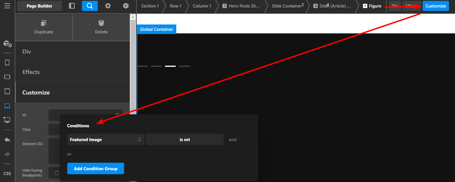 If you inspect the elements within the Hero Posts Slider, you’ll see the elements using Dynamic Content. For example, the Image element uses the Featured Image Dynamic Content so your posts must have a featured image.