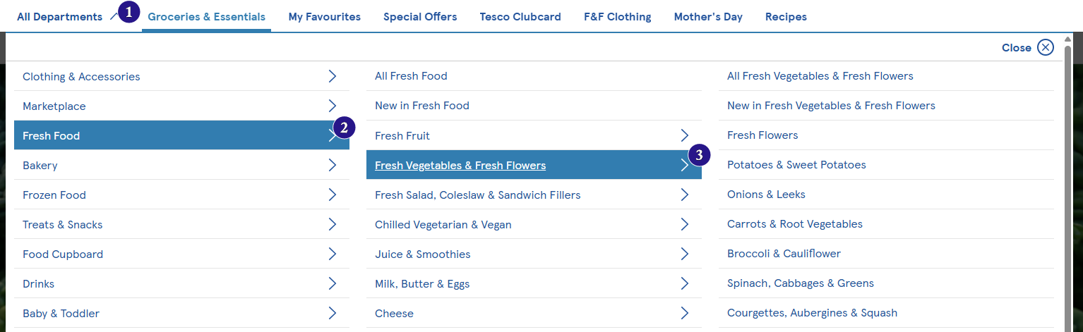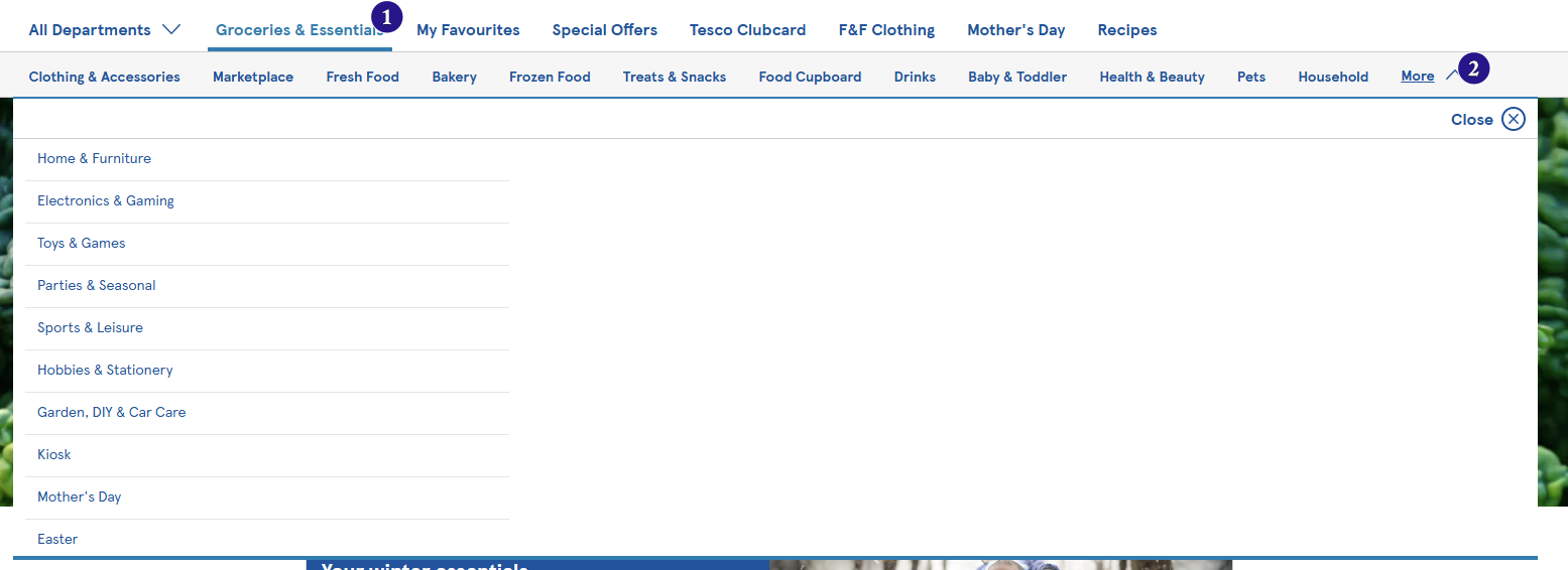 The second thing I have been asked is whether we can replicate the next type of menu item. Click 1 opens a child bar with inline menu items. Click 2 opens the “More” dropdown. However, whilst we see 12 submenu items in the child bar, on smaller desktop screens, we may only see some of them, say for example, upto “Food Cupboard” - all the other items to the right are then seen under the “More” button’s dropdown.