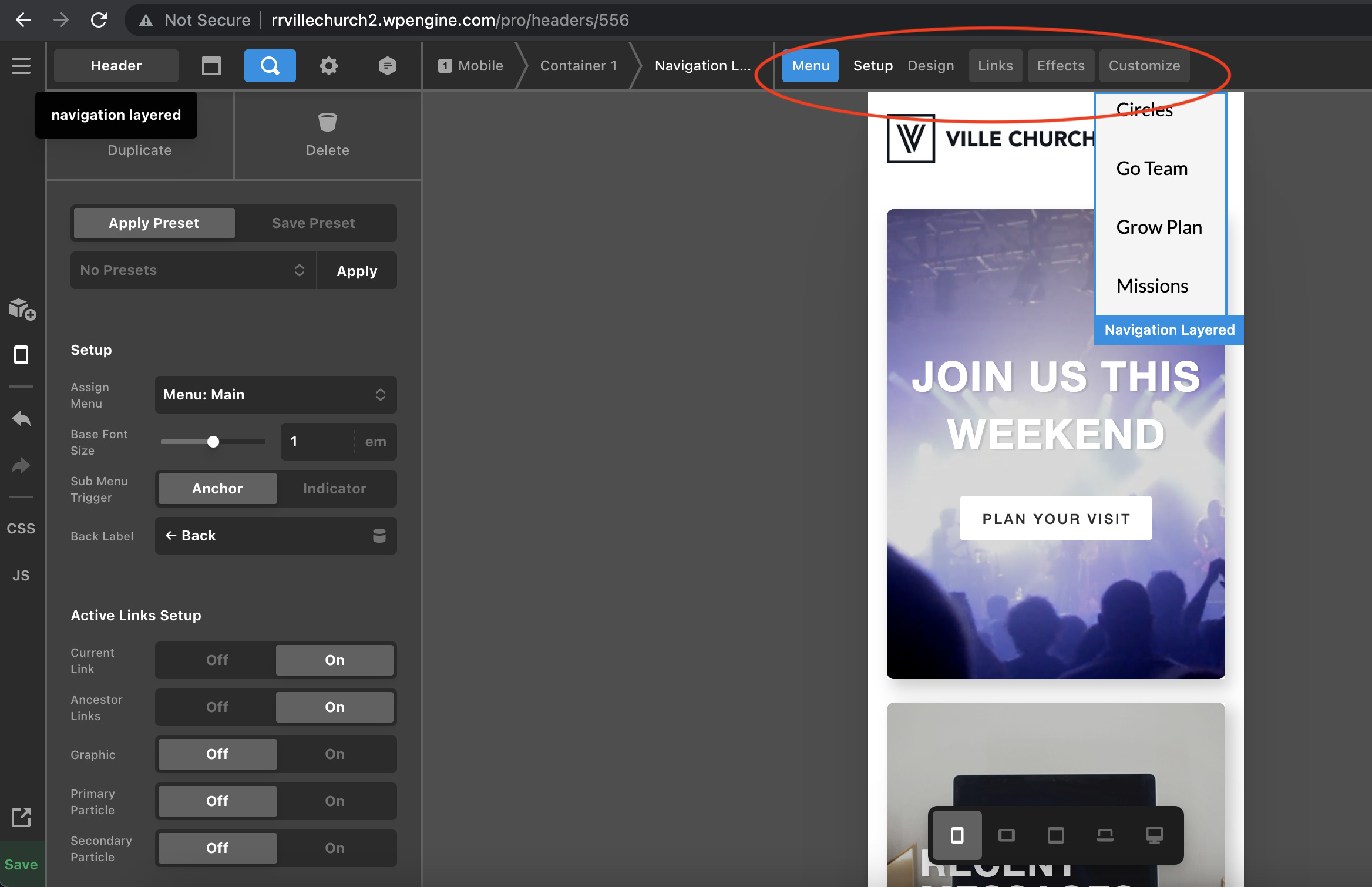 Not sure what I am missing — but there are no toggle options (hamburger to open menu) when I am adding the Navigation Layered element. I was using the Navigation Dropdown menu (which has the toggle options), but now that I have sub menus I need to rebuild for mobile because the dropdowns were going off screen.