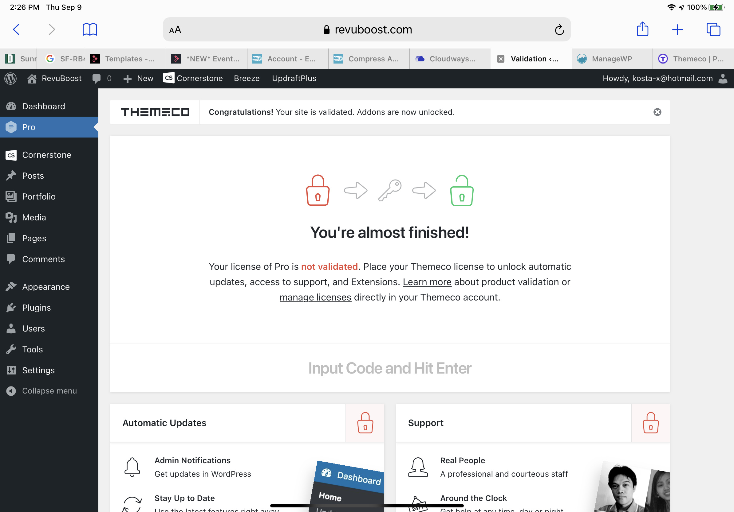 And in Pro > Validation, you will need to insert the license code and validate the Pro theme. Once validated, you will see the extensions list below and have access to other features like the Design Cloud.