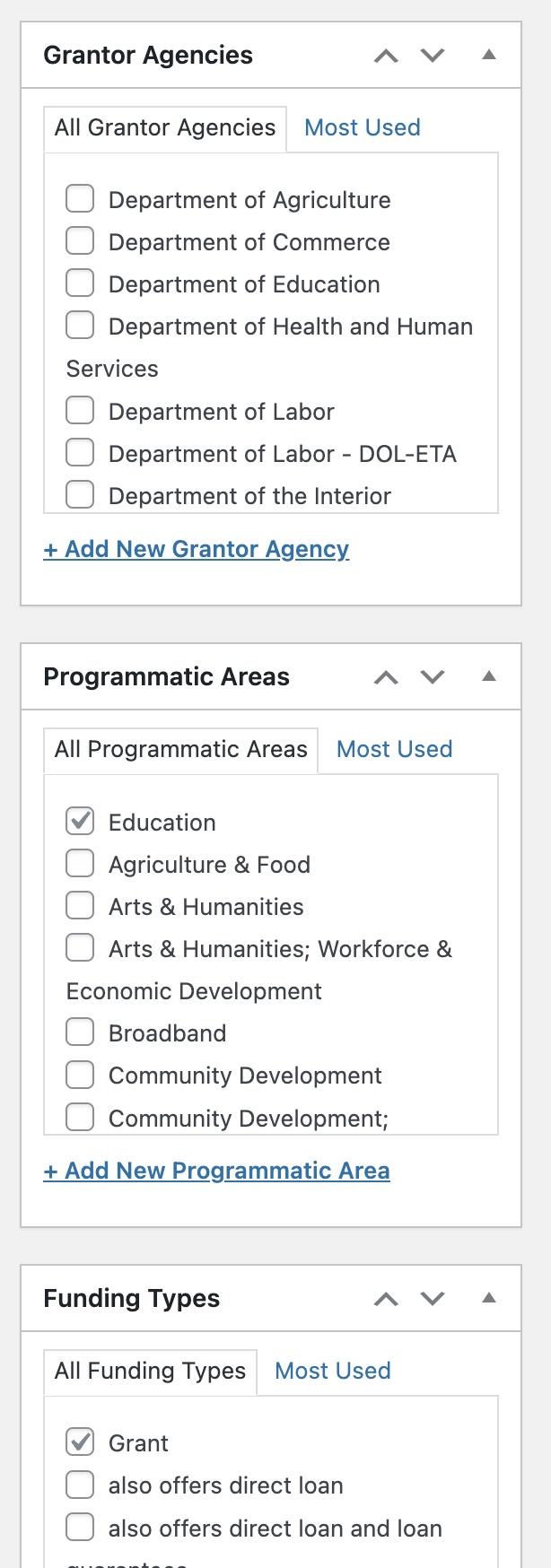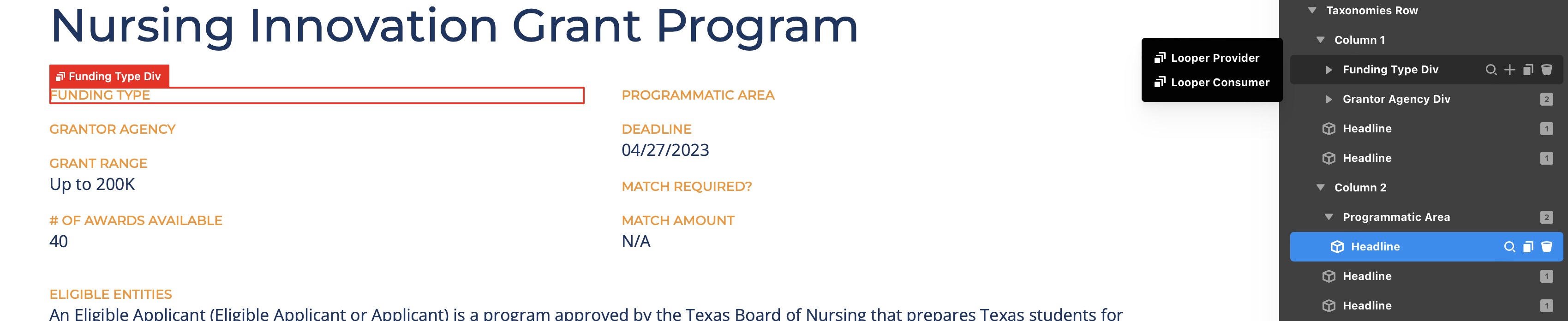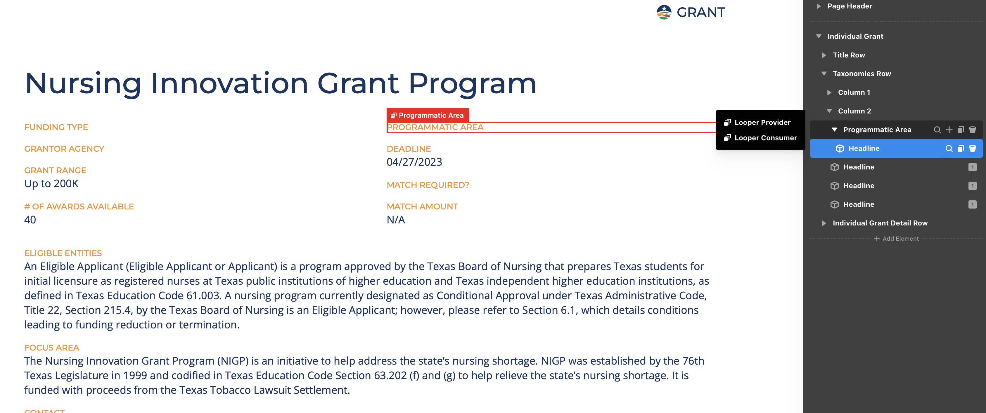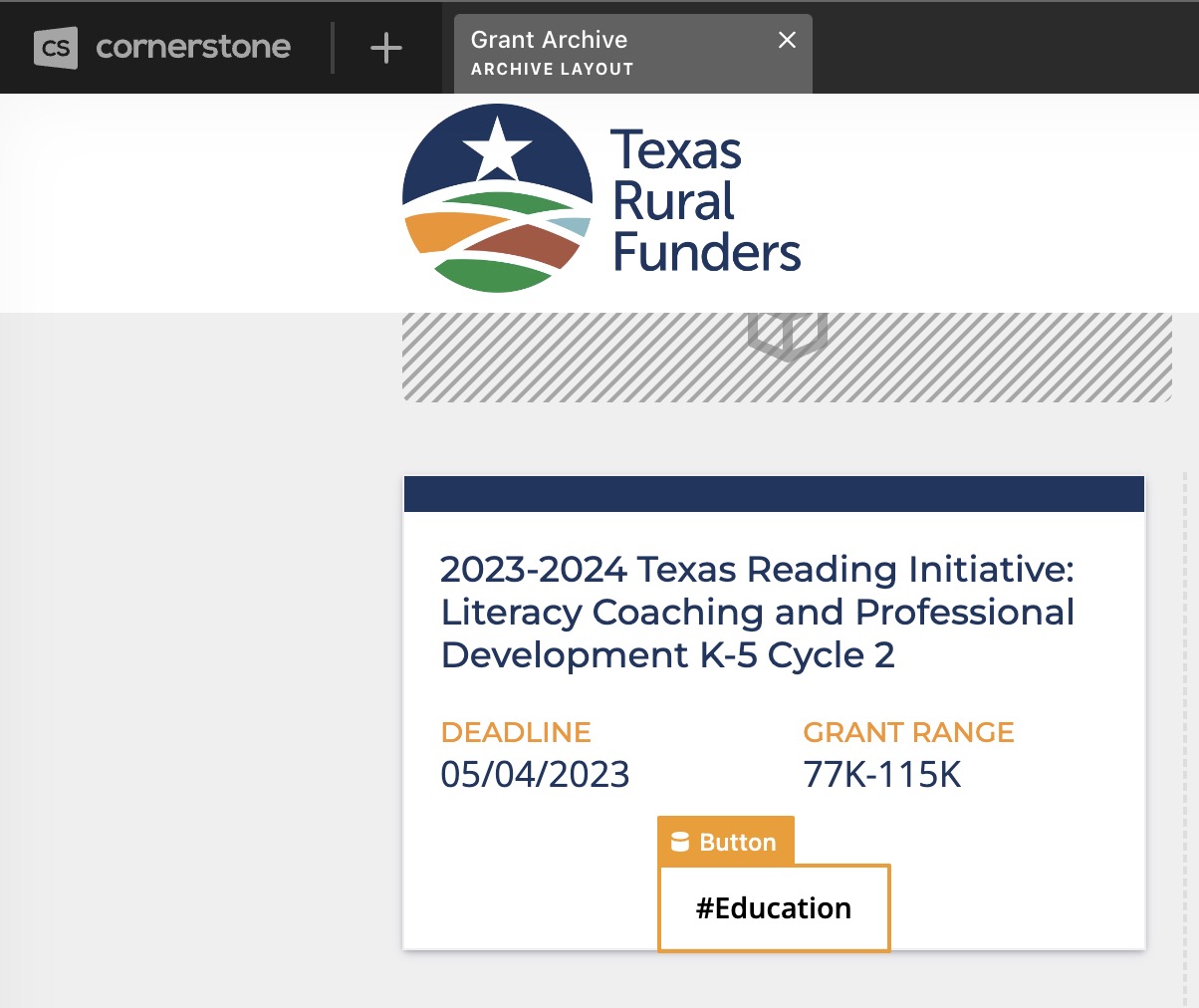 Also on the archive page, https://wordpress-213388-3215986.cloudwaysapps.com/grant/ I’m trying to show the value of the custom taxonomy for programmatic area, but nothing is being returned either. I tried to replicate what I did on another archive that works perfectly, but to no avail.