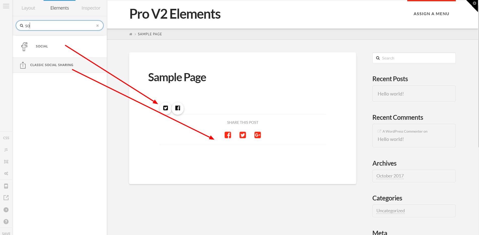 On the other hand,version 2 SOCIAL element is like a button. By default it shows FB icon that we can add link but we can also add text on it. On the options available like all other elements, we have the option to select other icons, change font size, borders, padding, etc.