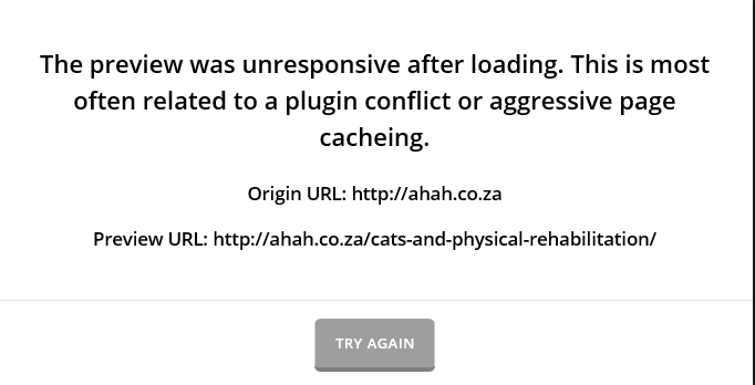 The preview was unresponsive after loading. This is most often related to a plugin conflict or aggressive page cacheing.
