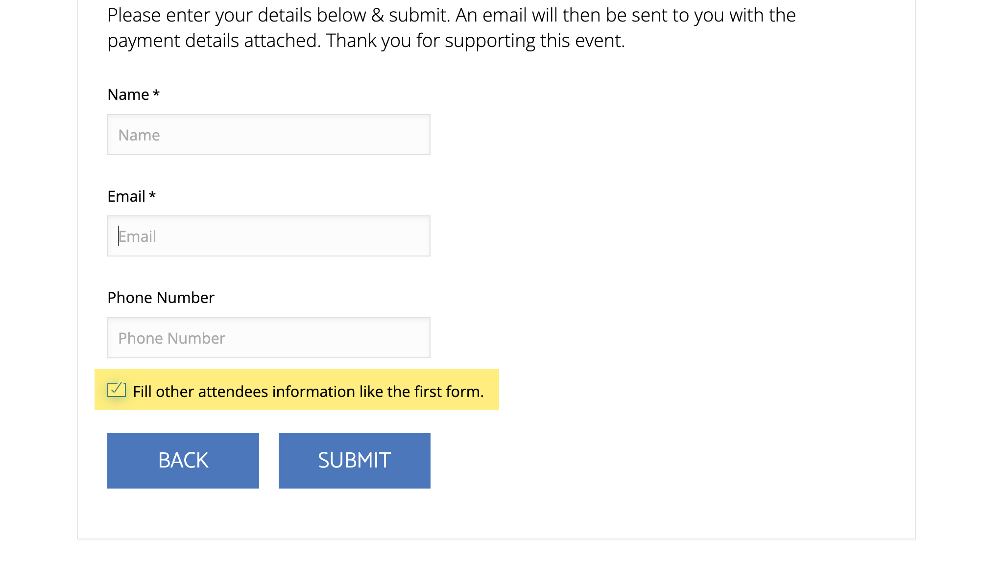 Hi, I’m using Modern Events Calendar and when you go to book tickets, if you want more than 1 ticket, a checkbox with a line of text saying ‘Fill other attendees information like the first form’. I’ve highlighted it below: