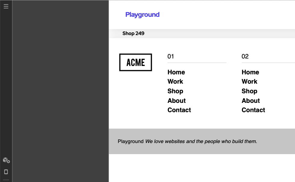 The new layout will load, however it does not show the starter templates, there is nothing in the inspector nor builder. In the screenshot here, the “Shop 249” is a header bar, followed immediately by the Acme footer. A refresh immediately brings the starter template options to the page.