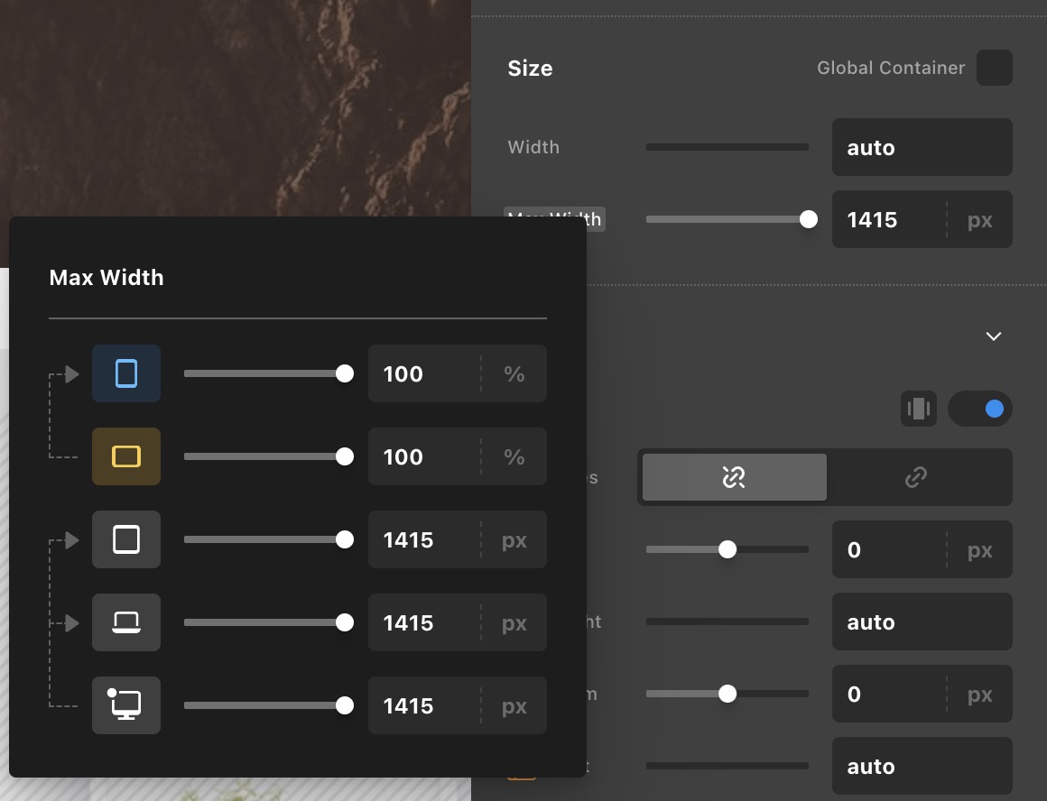 Thanks for writing in! In your Row element “Global Container”, please set a maximum width of 100%. You may also need to do this in your Slider Container element.