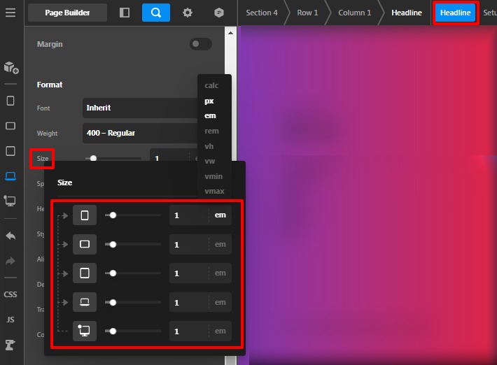 I would suggest you go to the page —>Headline element —>Format—>Click on the Size—>You would get an option to set the font size for small screens and larger screens as well. Please have a look at the given screenshot below.