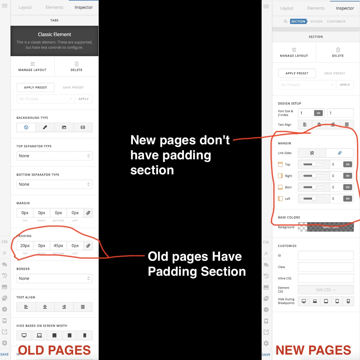 - My newer pages are missing the padding section from the left edit column on all new pages in cornerstone.
