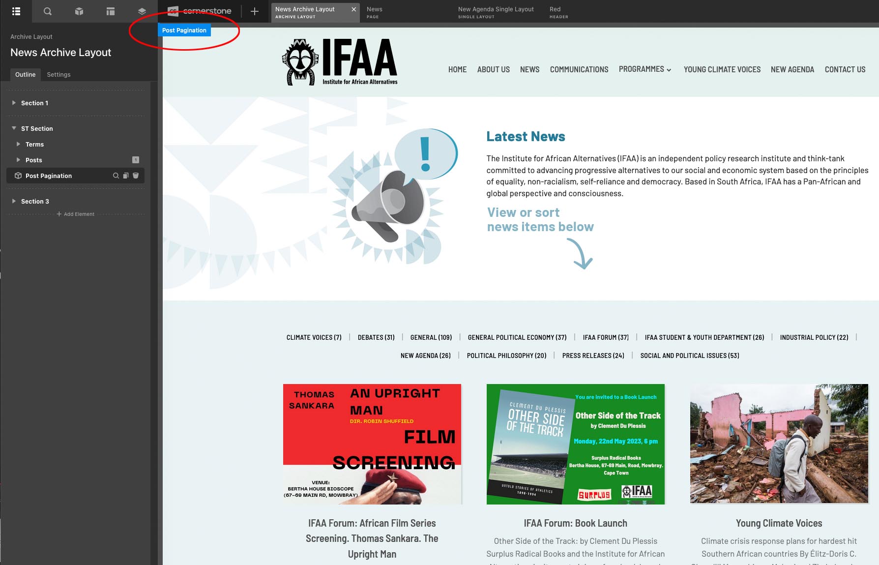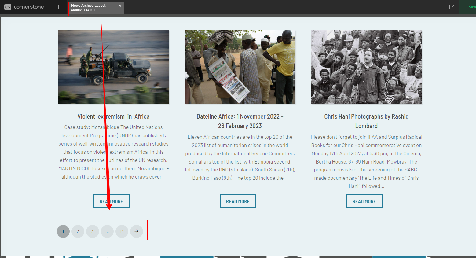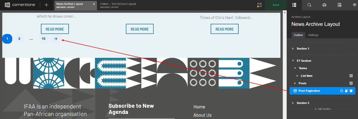 The standard Pagination element that comes with the archive page layout does not show up. This is an issue that appears the moment I choose an archive layout template, so this is before I have edited anything on the Posts.