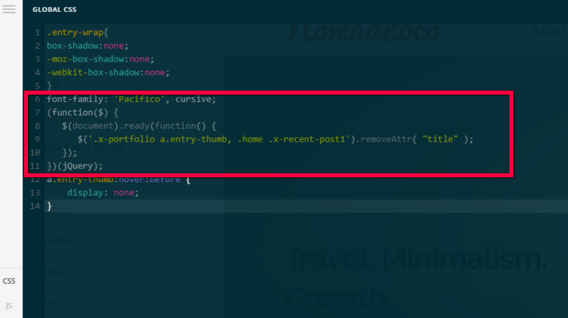 Please remove this block of code in the custom CSS because that block of code is not CSS.