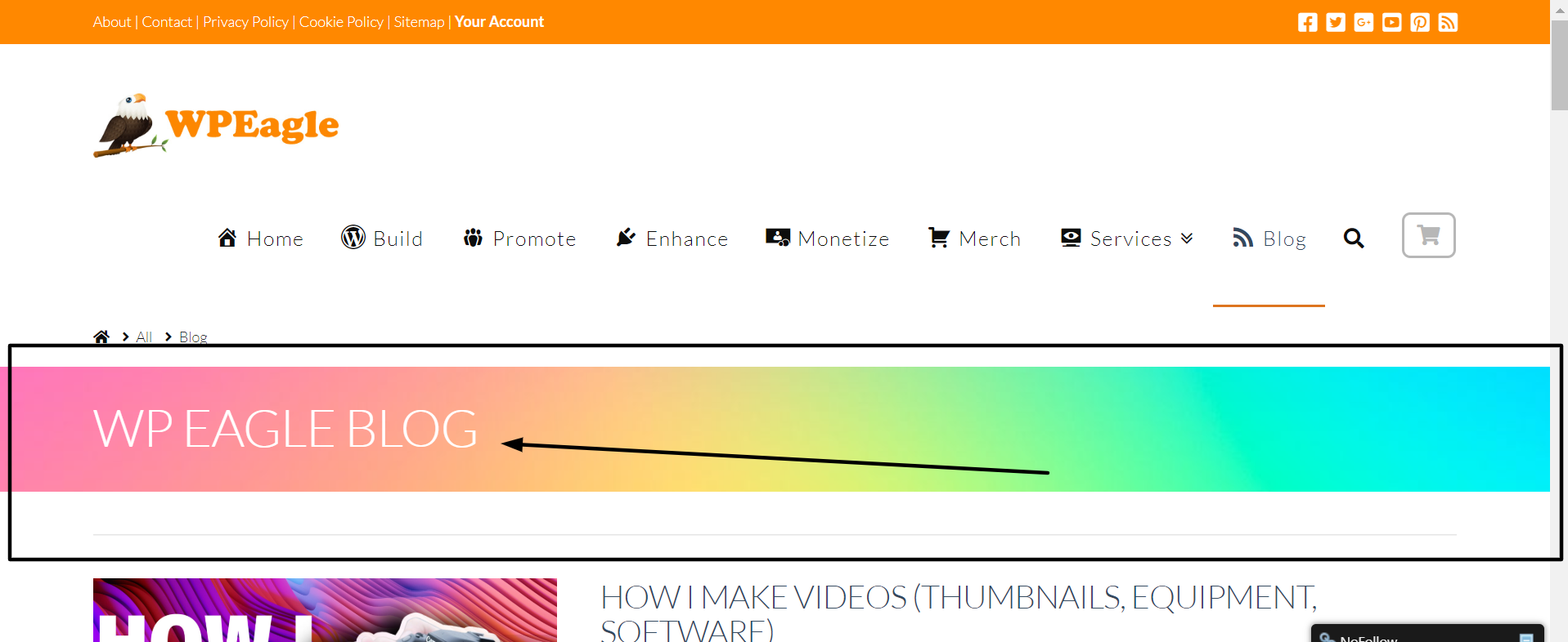 Thanks for posting in! The WPEagle site is using the X theme with the Ethos stack. The navbar is the default navbar displaying the logo, menu navigation breadcrumb and the landmark header which has the Category title in it.