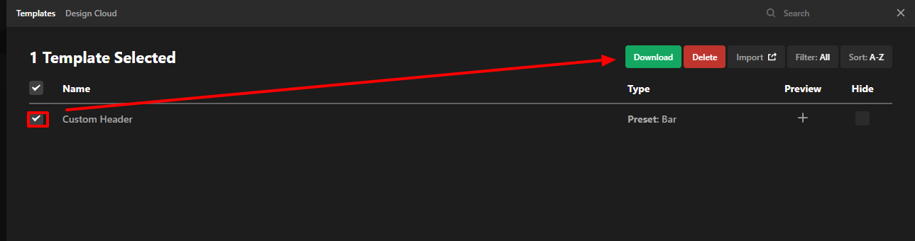 After you have done saving the header bar as preset, it will be available on your Template Manager page. Then click the preset and you will see a download option and you will a .tco file.