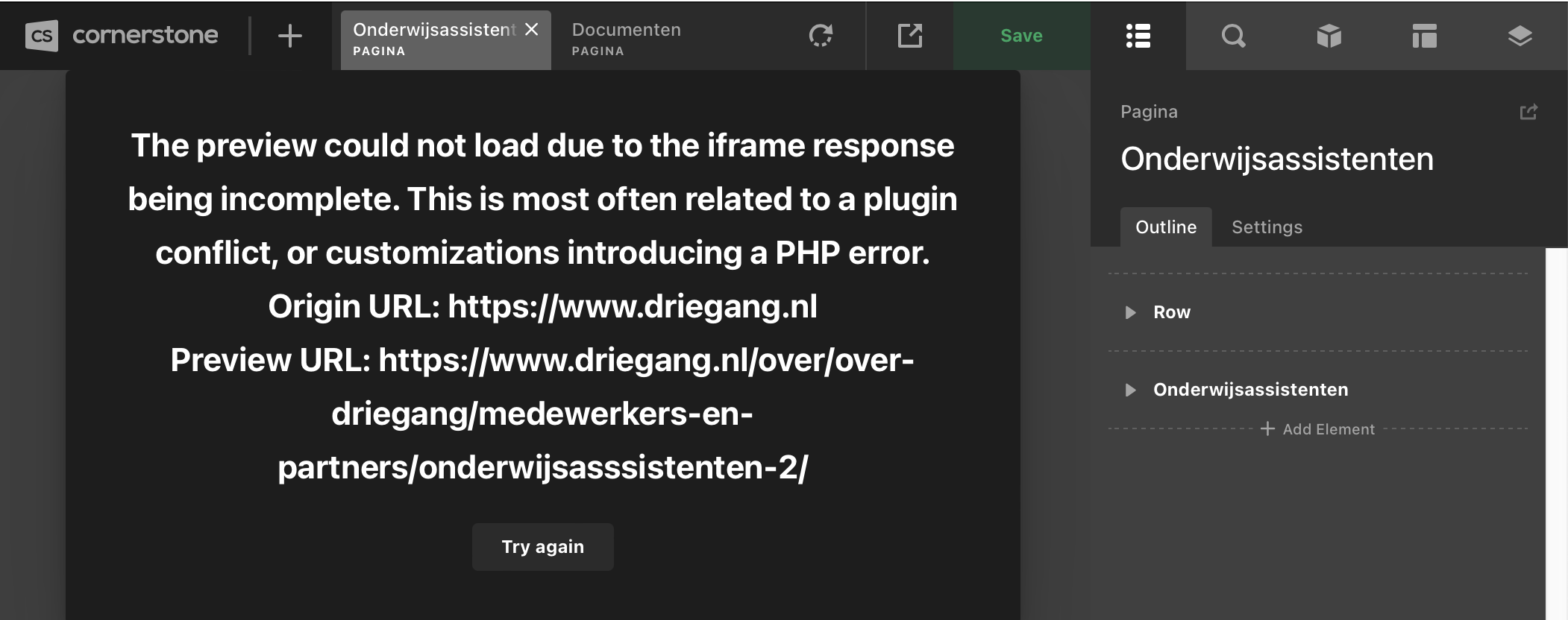 After checking the page, I found that the issue is caused by the second section named Onderwijsassistenten . I replicated the content on a separate page and removed that section, and the page loaded correctly. This suggests that the problem is likely due to broken HTML or problematic content within that section.