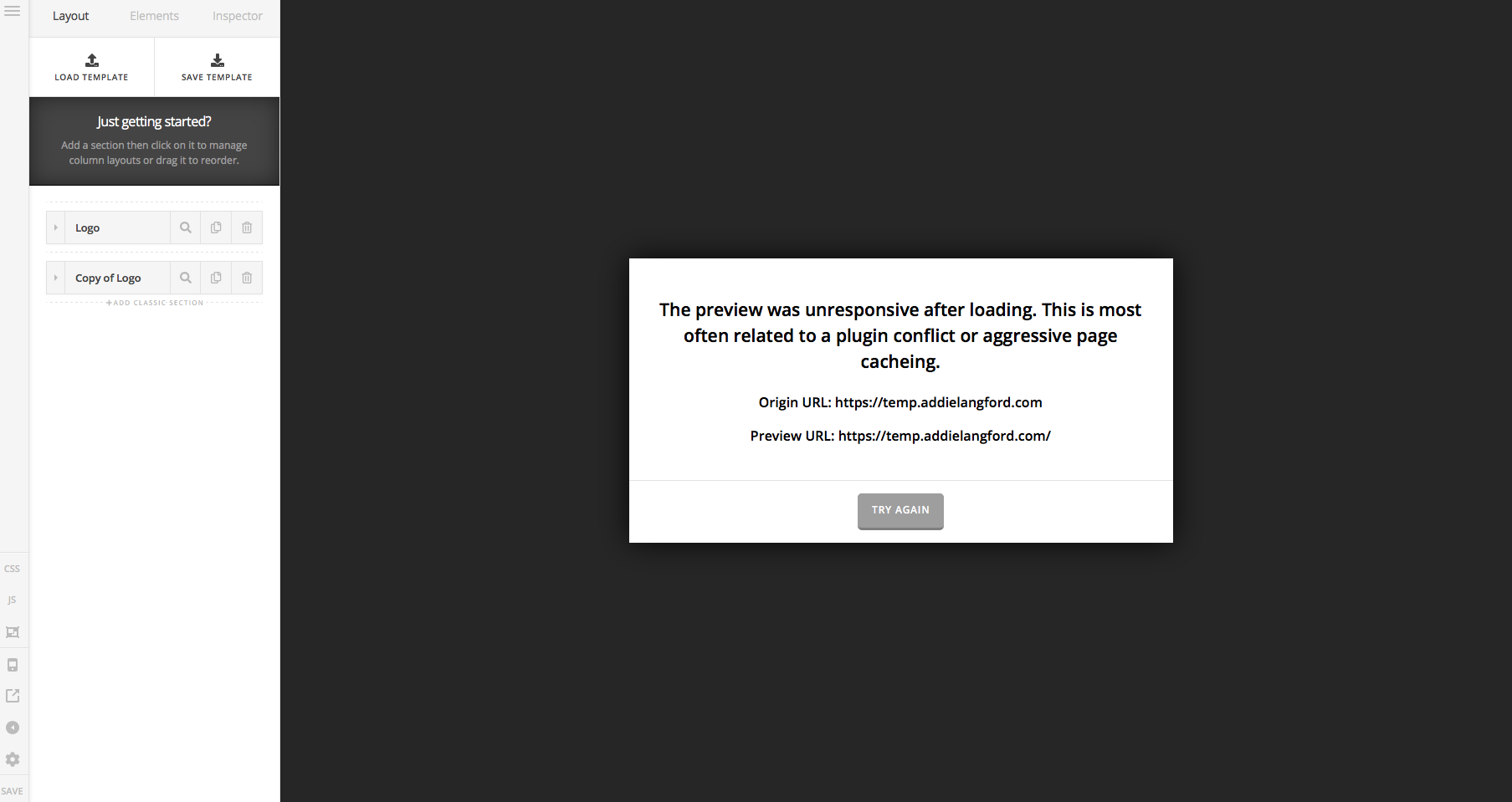 The preview was unresponsive after loading. This is most often related to a plugin conflict or aggressive page cacheing.