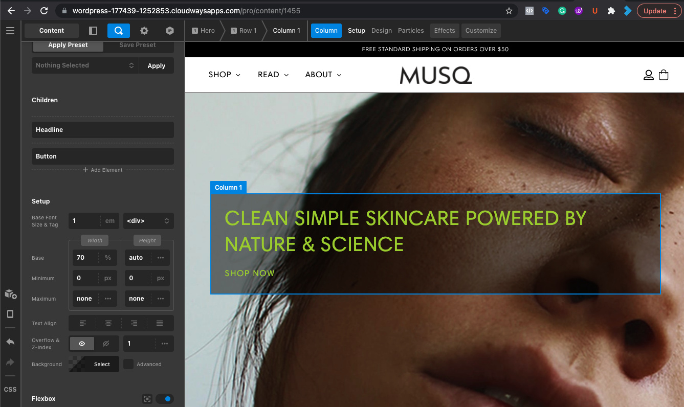 No, I want the Base width to be 70%… and the maximum width to be 800px. So across desktop it is 800px, and then into Mobile when the screen is less than 800px wide the column is a Base of 70%.