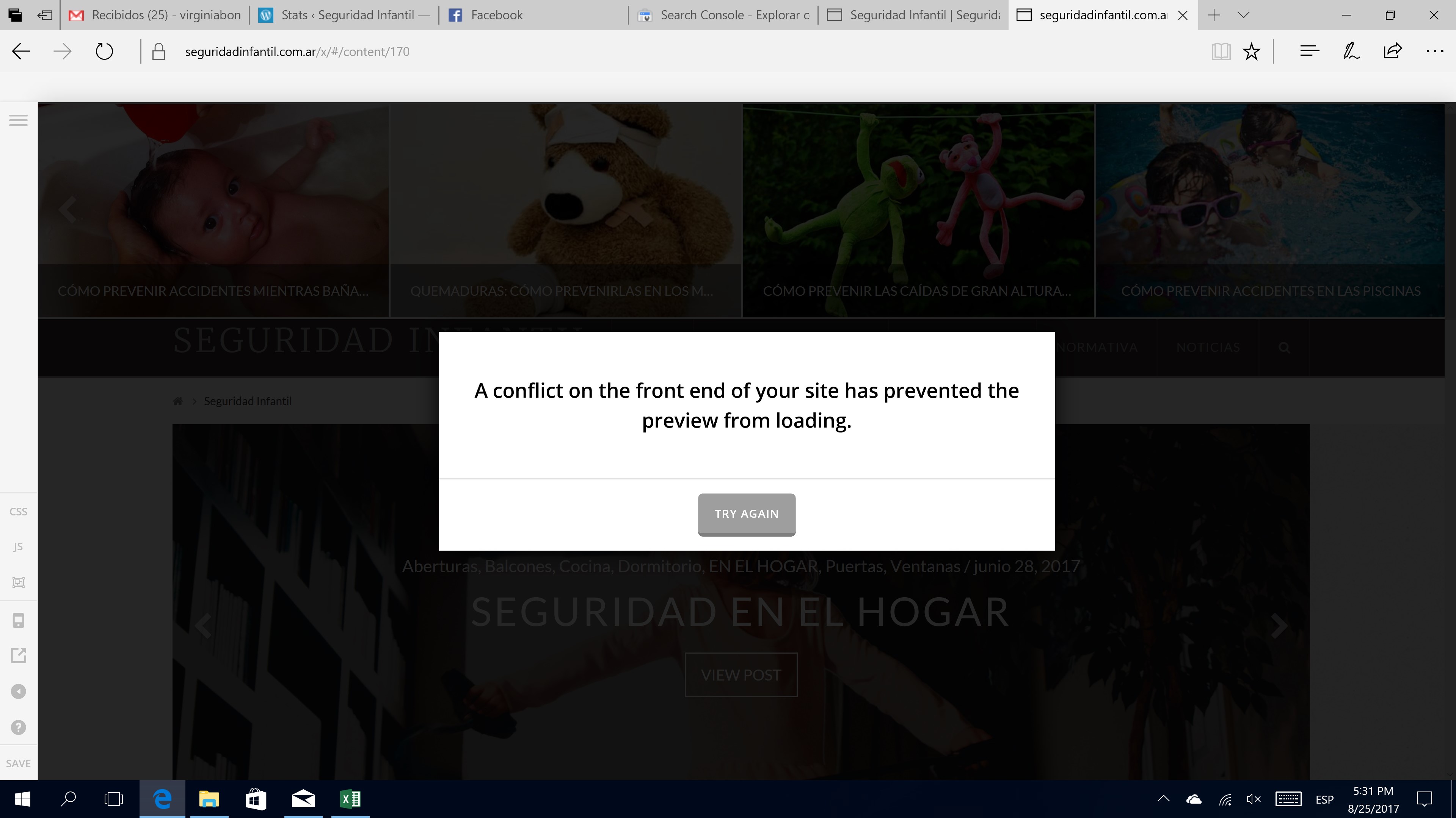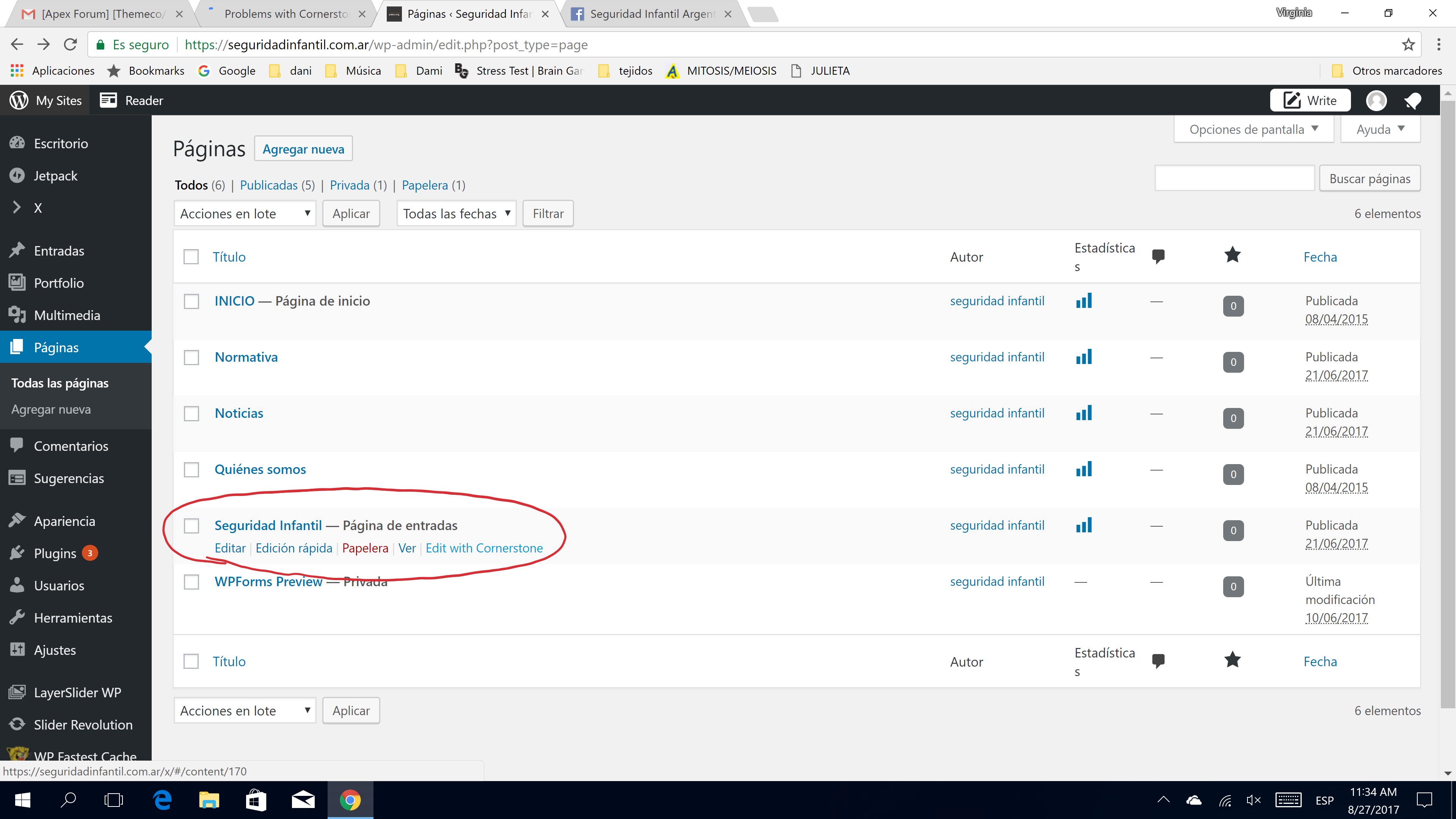 The problems appears only in that page (Seguridad infantil - página de entradas) highlighted in red in the image attached