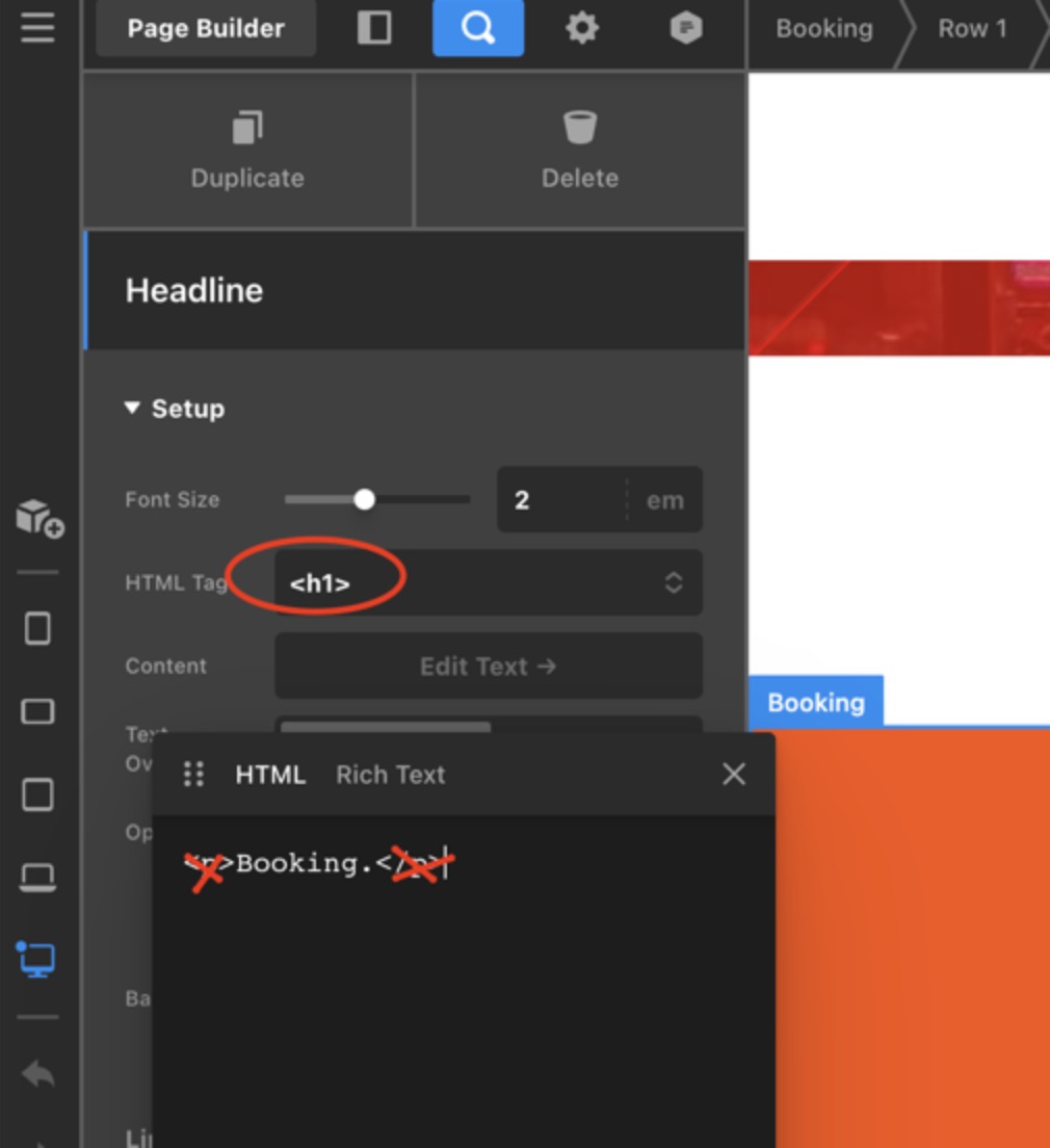The problem is that in your Headline elements, you are using this: <p>Booking.</p>. The paragraph tag is not necessary because the headline elements have already the heading tag.