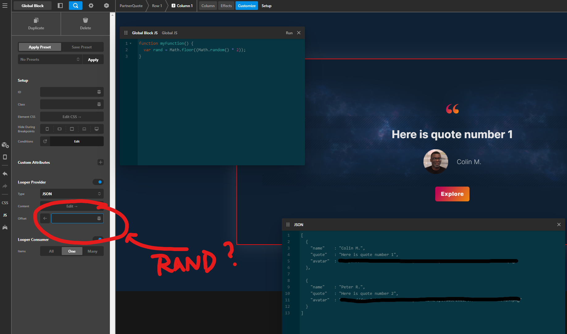 I am using Looper Provider (Type JSON) and Consumer on the same column and was hoping to randomise the count offset in order to display a different dataset each time the page is loaded.