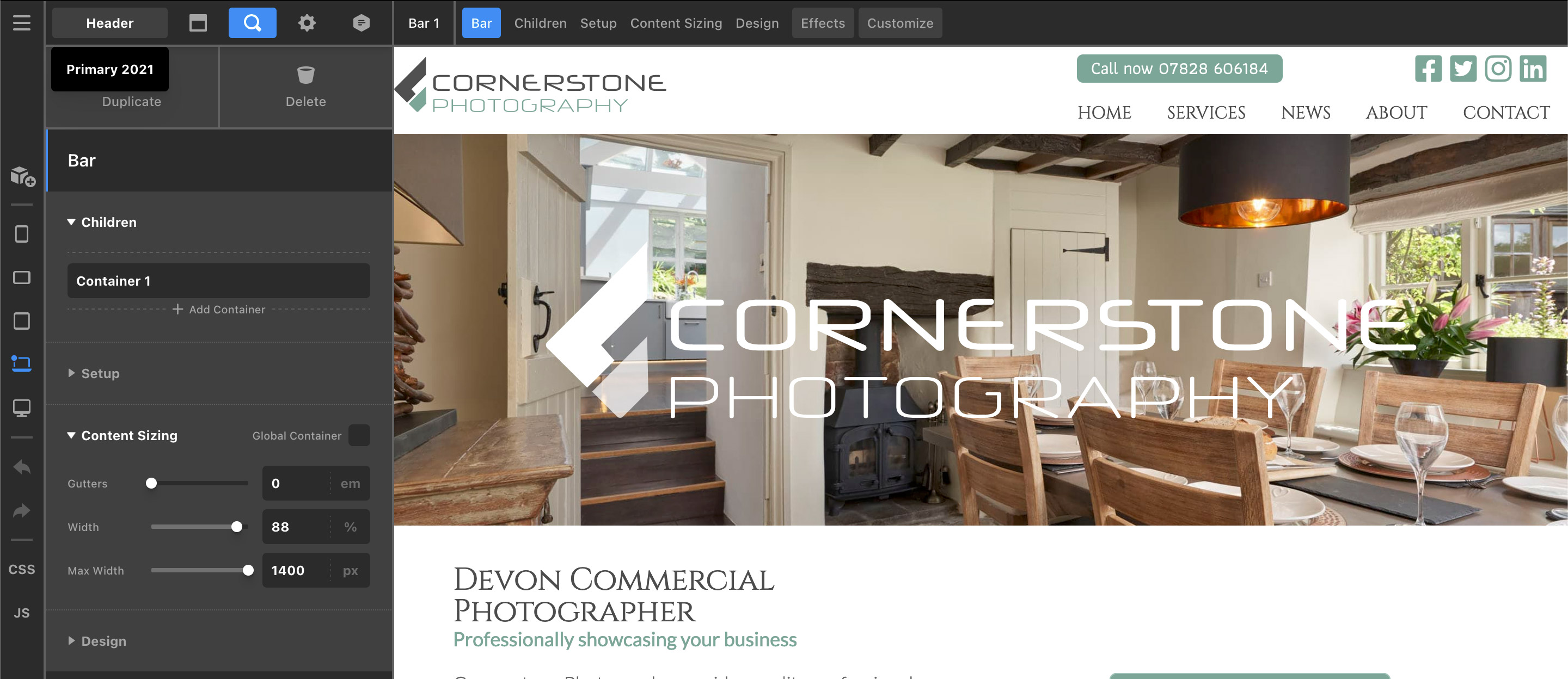 I have a header bar with a width of 88% and max width of 1400px. On the live site this displays correctly.