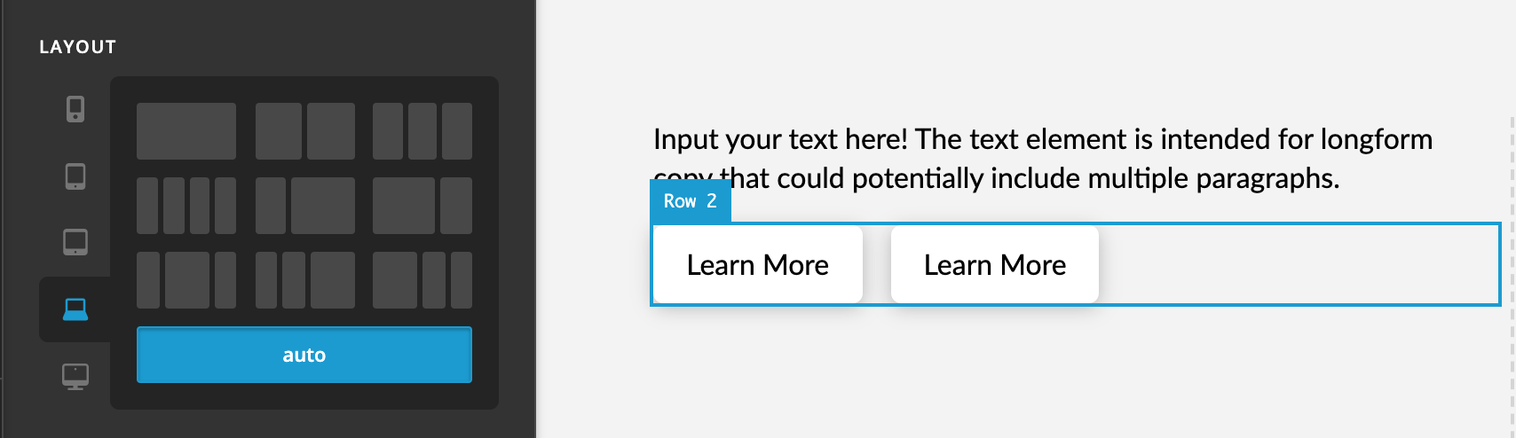Just saw this thread. If I’m understanding what you’re wanting to do, you wish for the buttons to respond to their own line once there is no more space for them, correct? You should be able to do this without any sort of custom CSS. I tried the links you provided above, but cannot seem to access them. If you use explicit widths on your column layouts, you will need to make sure to break it manually at a specific breakpoint to 100% so that they can fill up all space. Alternately, if you want the columns to “auto-respond” to the content of the buttons and break when they need to, you can do this: