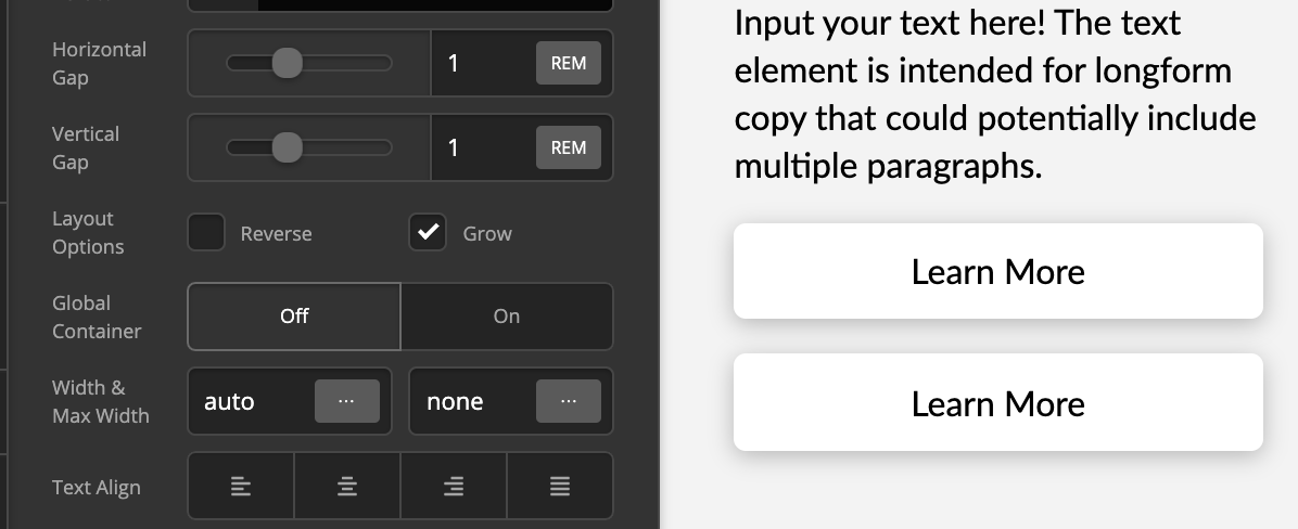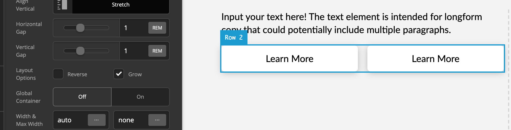 Additionally, you can get a 50 / 50 look by checking the Grow checkbox on the nested row to ensure that your Columns fill all available space in addition to making the Button’s width 100%. This will give you: