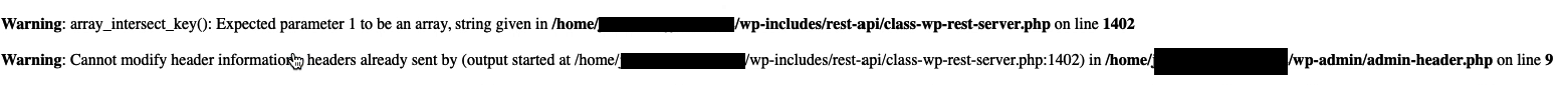 Warning: array_intersect_key(): Expected parameter 1 to be an array, string given in /home/redacted/redacted/wp-includes/rest-api/class-wp-rest-server.php on line 1402