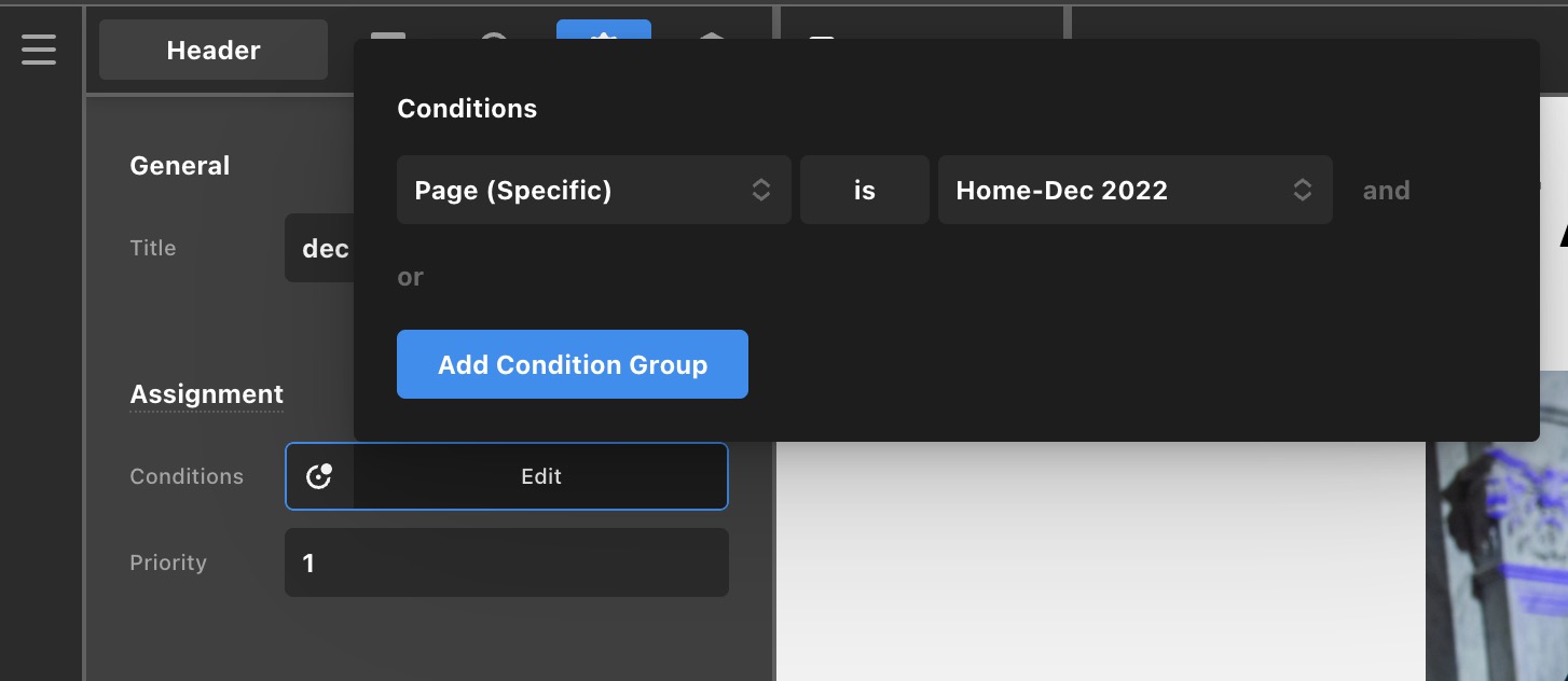 the header displays on a live page but doesn’t display on the real time canvas–this particular page displays a conditional header