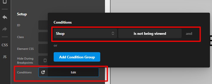 To hide the bar on the shop page , you need to go to the Header builder —>Click on the Bar magnifier icon—>Customize—>Condition—>Set the condition like this.