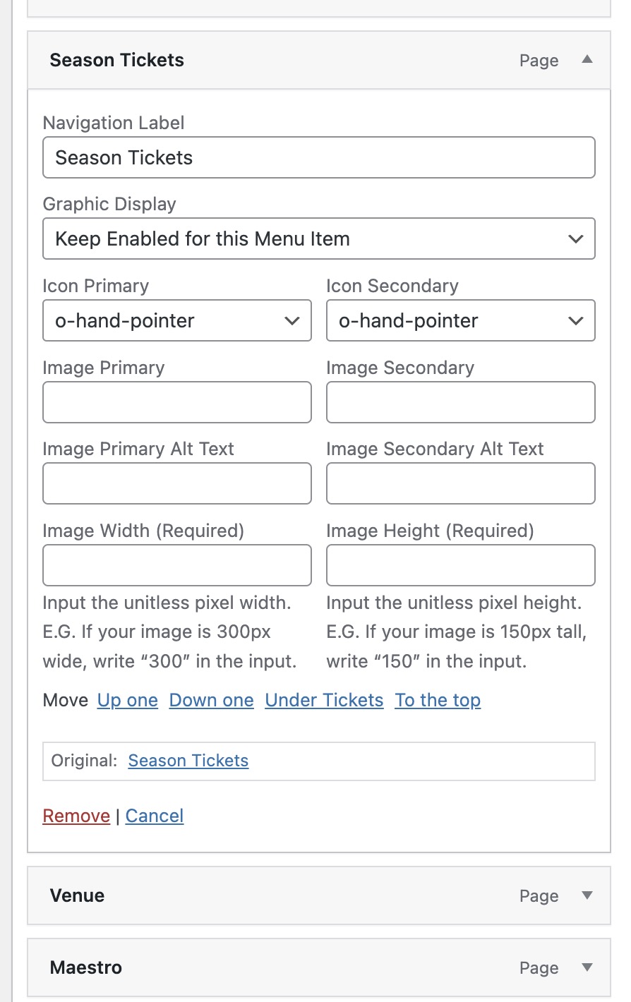 2.) Go to Appearance > Menus where you can remove the “Season Tickets” menu item.