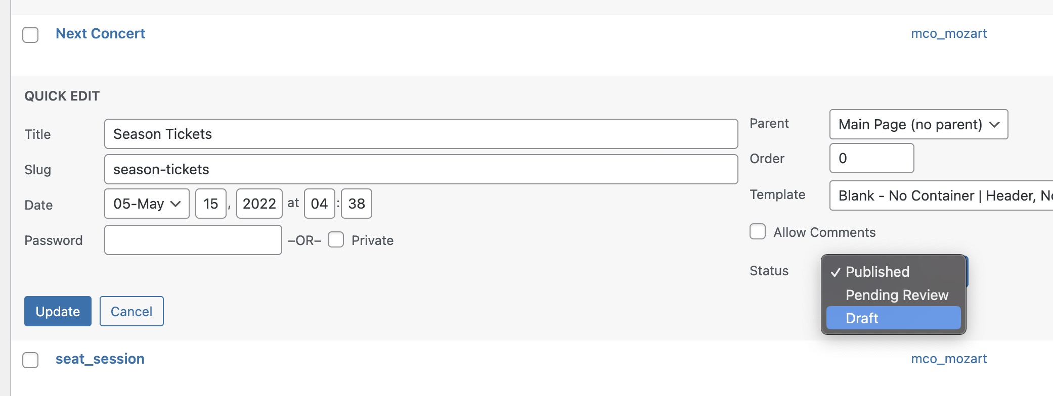 1.) Edit your “Season Tickets” page and set it to “Draft”.
