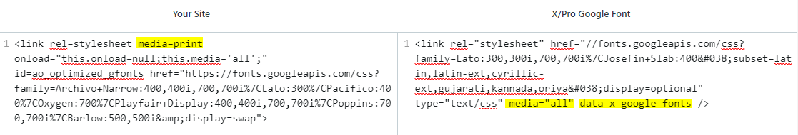 I could say that because the media attribute value of Cornerstone’s font is “all” while it’s “print” on your site. Cornerstone also has data-x-google-fonts as a link attribute. You can see the comparison in the screenshot below.