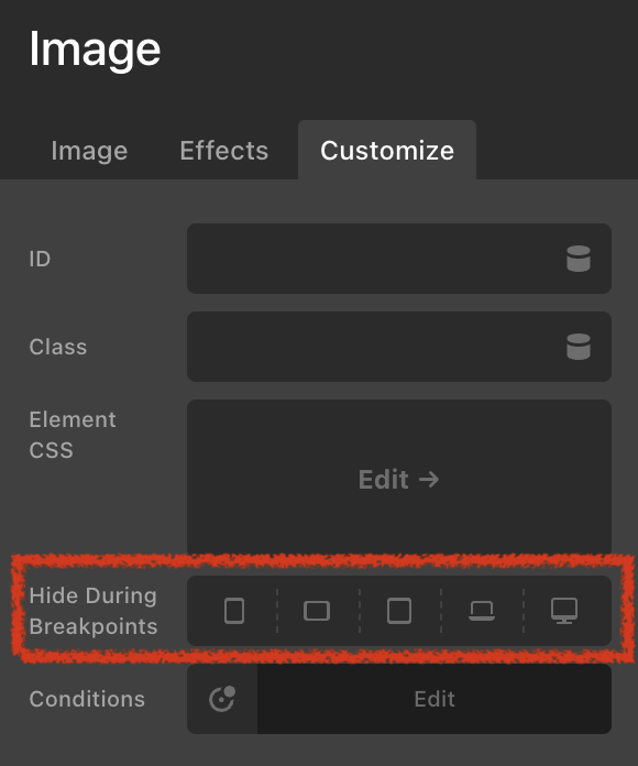 For .svg to be accepted by Wordpress you’ll need a plugin in case you want to use it as an image. If you just copy/paste the svg-code I suggest a “RAW Content” element, but this one doesn’t have the “Hide During Breackpoints” option… so you’ll need to place the “Raw Content” inside a DIV element. And the DIV you can make clickable: