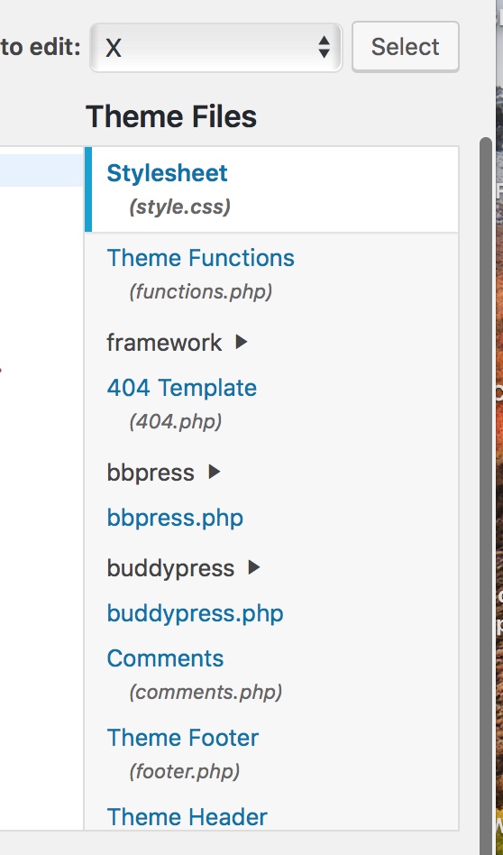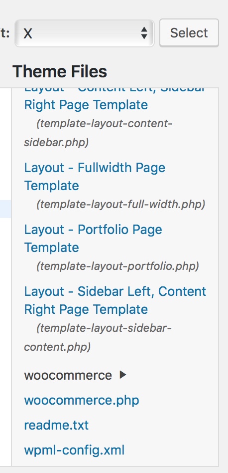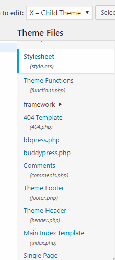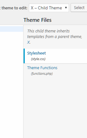 Here’s what a fresh child theme looks like in the WordPress’ theme editor page.