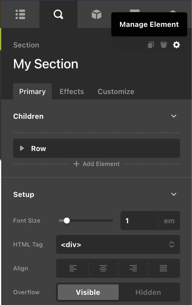 You can actually make your own custom Section element. Insert a Section element and make sure to set your desired element settings. Find the Gear icon in the upper right corner to manage the element. This is where you can save it as a custom Section element.