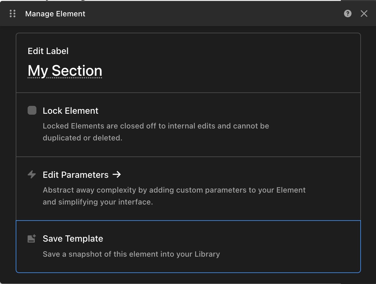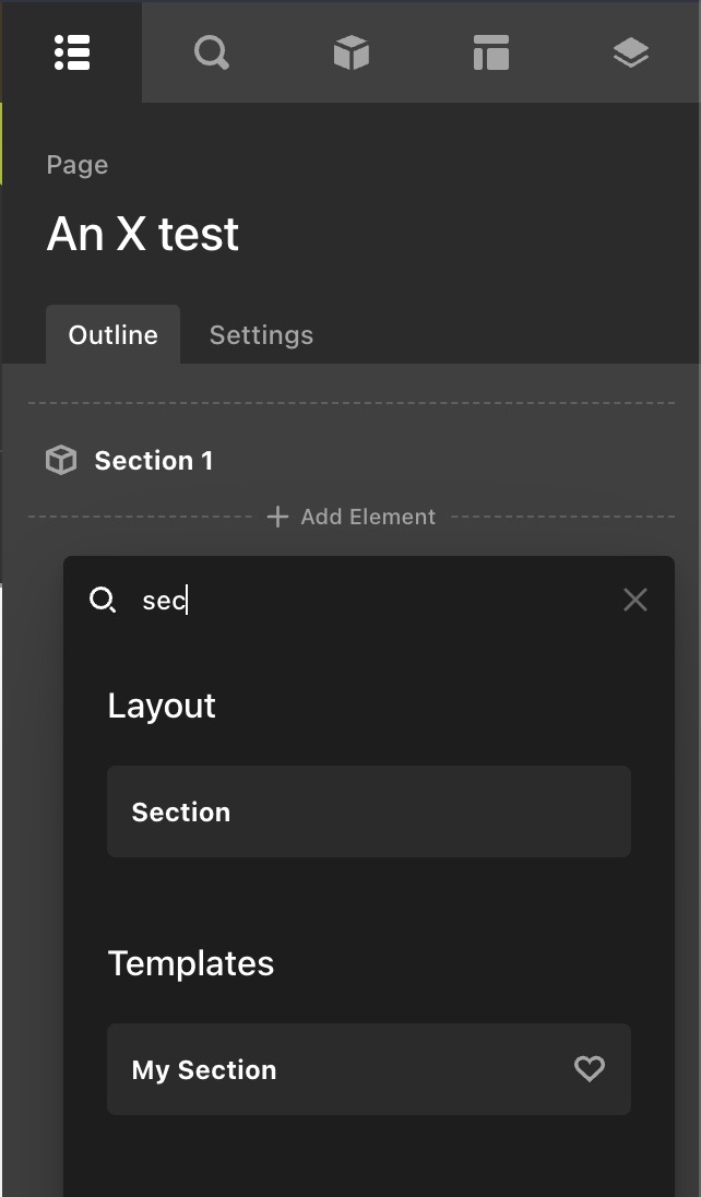 After saving it, every time you add a section, click the CMD button or CTRL on Windows to be able to “Add Element” where you can select the saved Section element template like this:
