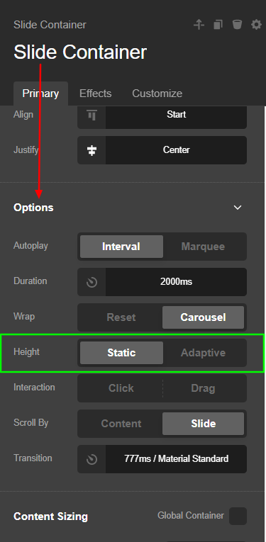 I was trying out the slider (stacked) element to create a kind of portfolio with the option flex box active. For some elements the paddings are really huge. Is it always using the size of the biggest element in one slider or can the padding be set dynamically for elements with less height? Maybe it helps to understand what I mean if you see the page I’m using it on. I’ll send it in a private window.
