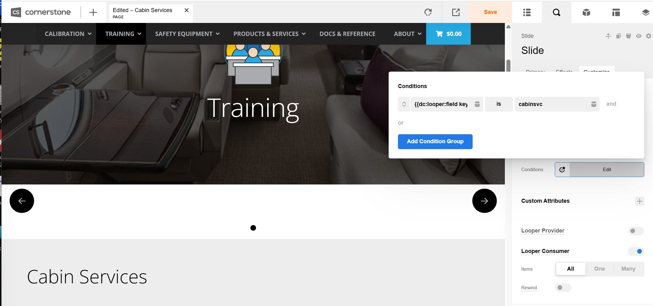 Then, I’d like the slider to appear on each page, with only that department’s relevant testimonials appearing. Is this possible? I’m imagining there’s something in the conditions field I could enter so that only the “Products” testimonials show up on the page about our products, and the “Services” testimonials show up on the page about our services.