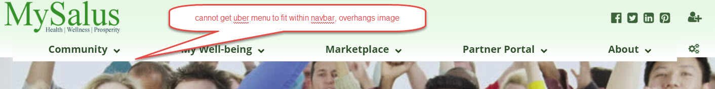 I would like to see how the menu looks full width but I can live with it the way it is now (seems constrained to uber menu width - yes is set to be unbounded). The issue I most want to fix is the uber menu height, which caused it to hang lower than the navbar and then overlay the header image. site reference https://mysalus.org