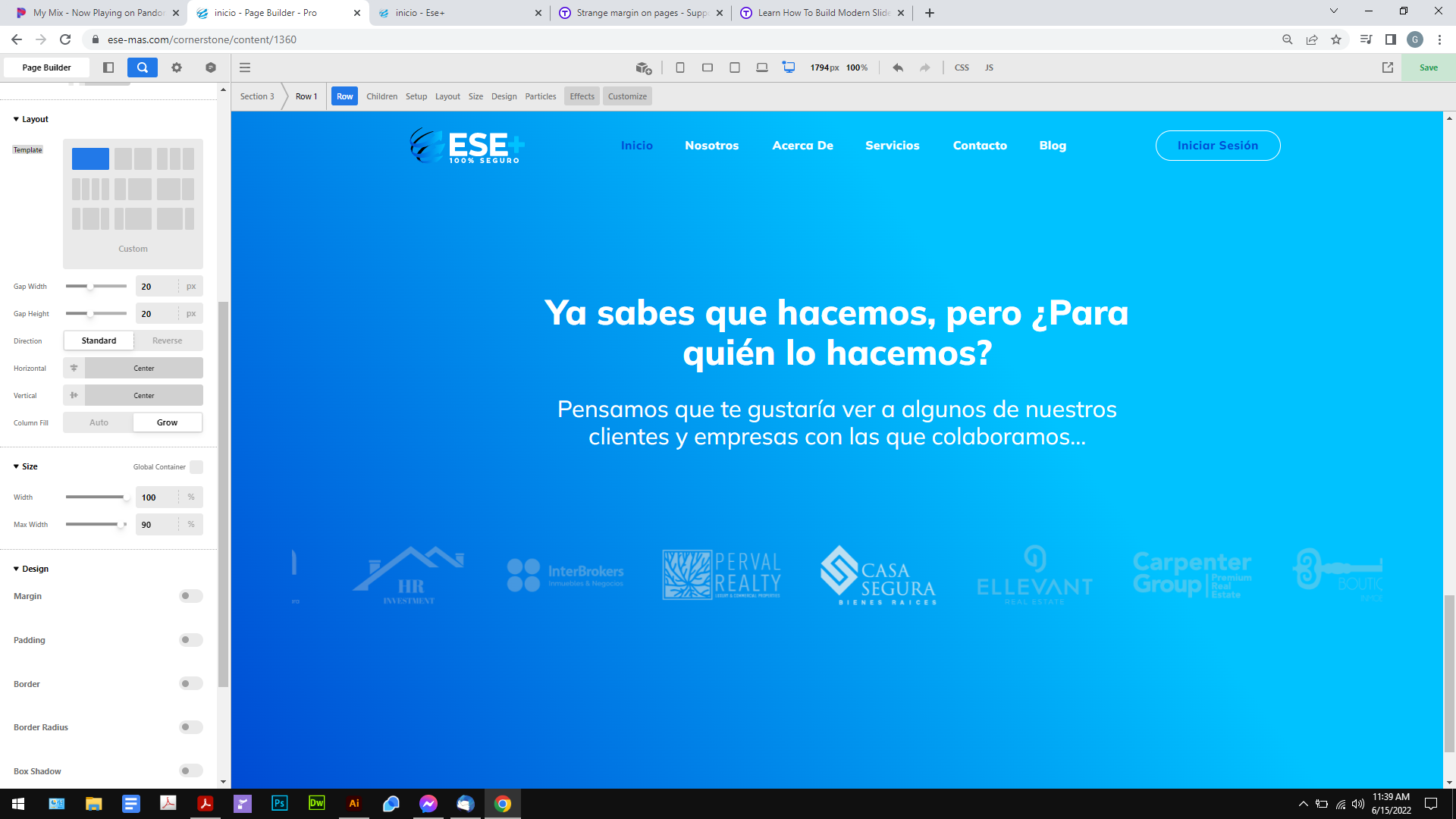 So the size cant have the global container, as it will cut off on the sides, it needs to be 100% width right? So I set it like this: