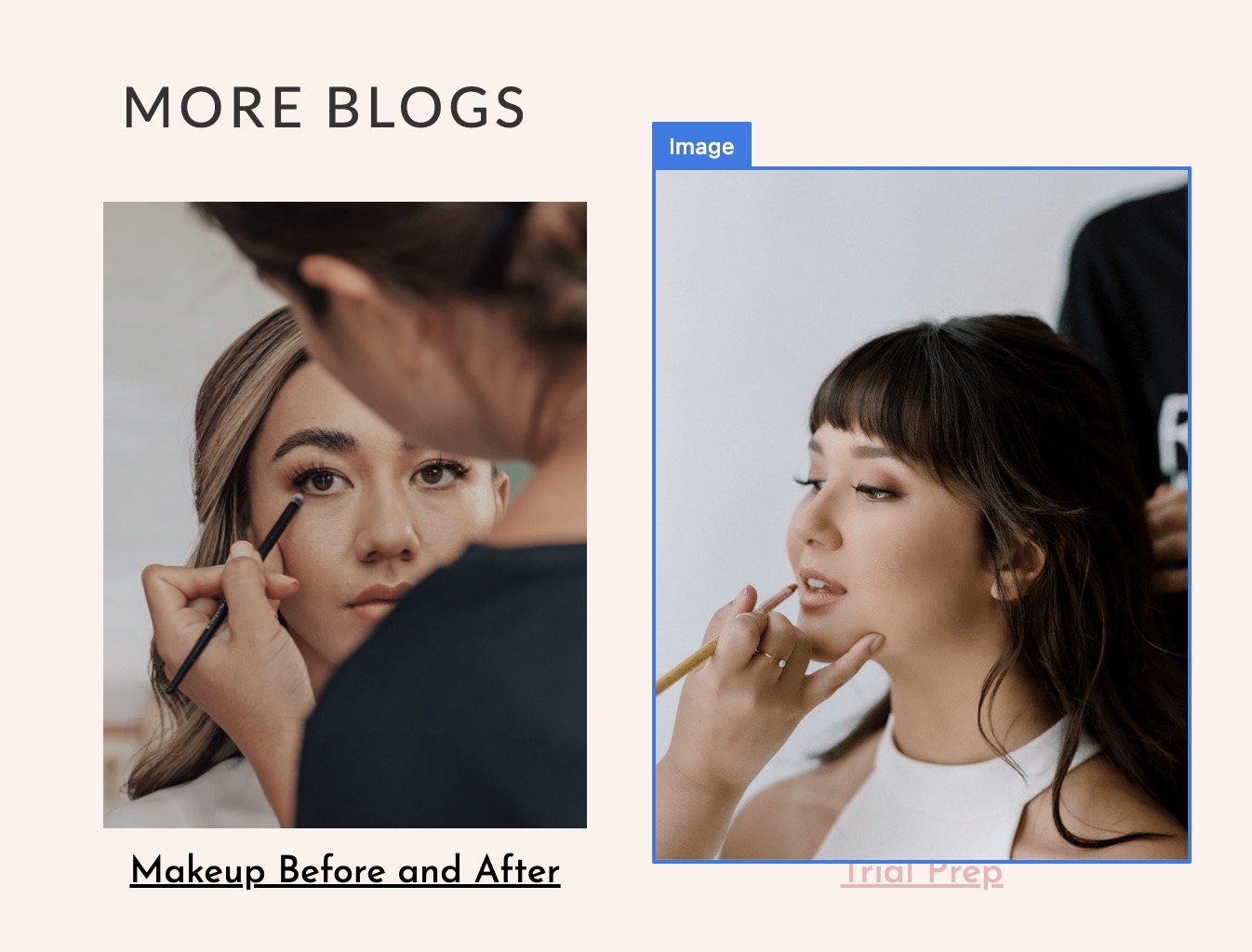 For example, when we hover over the first image in the first row, we want the words “makeup before and after” to change to pink as it would if you were to hover over the words. This was our user will know the image is connected with the words.