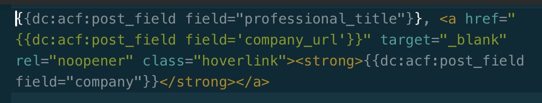{{dc:acf:post_field field="professional_title"}}, <a href="{{dc:acf:post_field field=" company_url="" target="_blank" rel="noopener" class="hoverlink"><strong>{{dc:acf:post_field field="company"}}</strong></a>