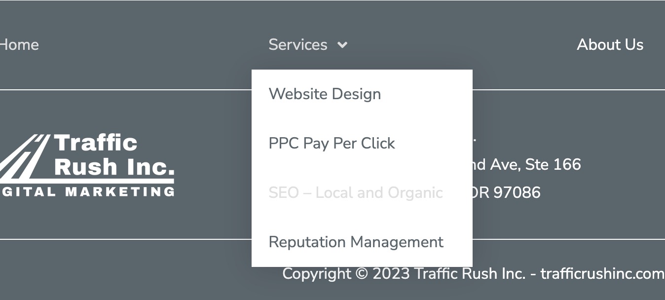 The Footer Menu has Services that has 4 Sublinks. When you hover over the 3rd link “Services” you can see the first letter S in “SEO - Local and Organic” is missing some pixels and when you try to click on it the drop down disappears.