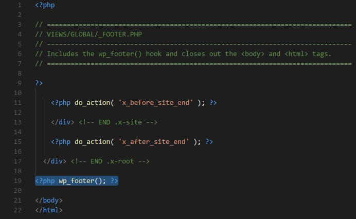 it has <?php wp_footer(); ?> on the line 19 not on line 1.