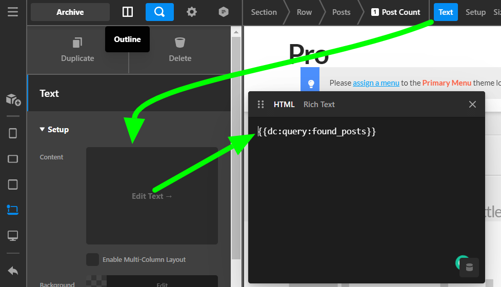 You can get the Total Post Count using the {{dc:query:found_posts}}. I went ahead and added a Text element with the Dynamic Content code which shows the count.