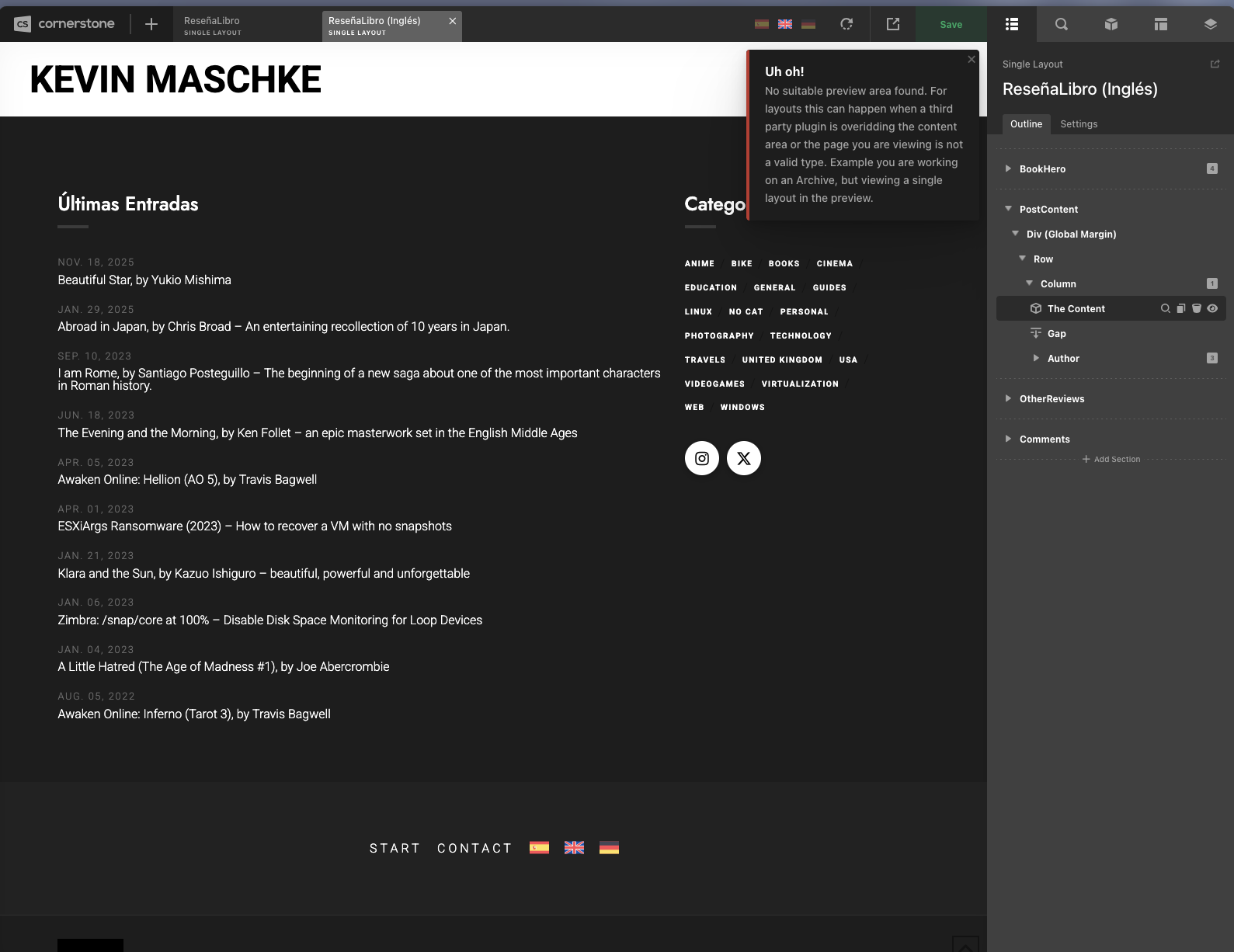 I’m trying to translate a Single Post Layout, but the preview does only show the header and footer, but no content. An error popup is shown with the following message: