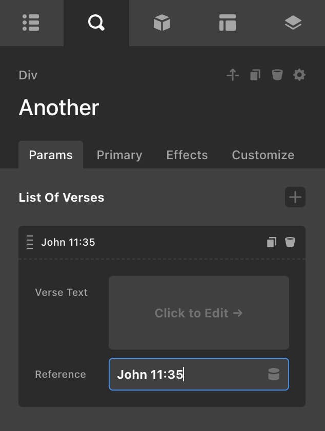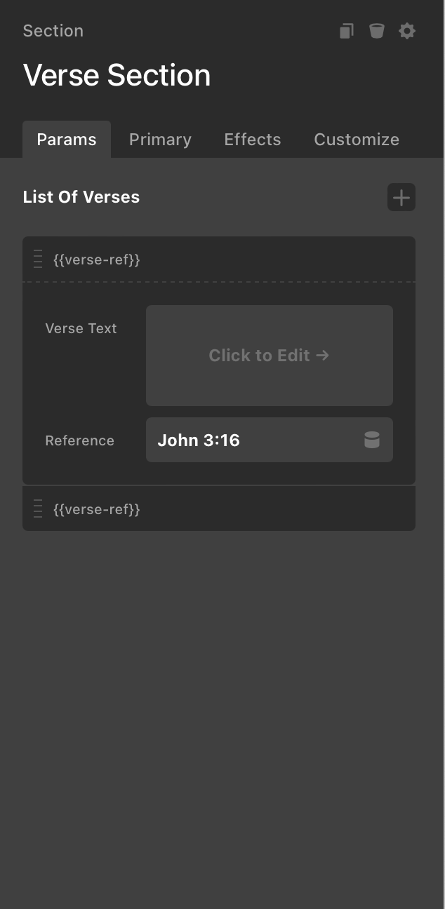 In creating the component with the parameters above, everything works except for the itemLabel. It’s just showing the actual text {{verse-ref}}. Not sure what I’m doing wrong.