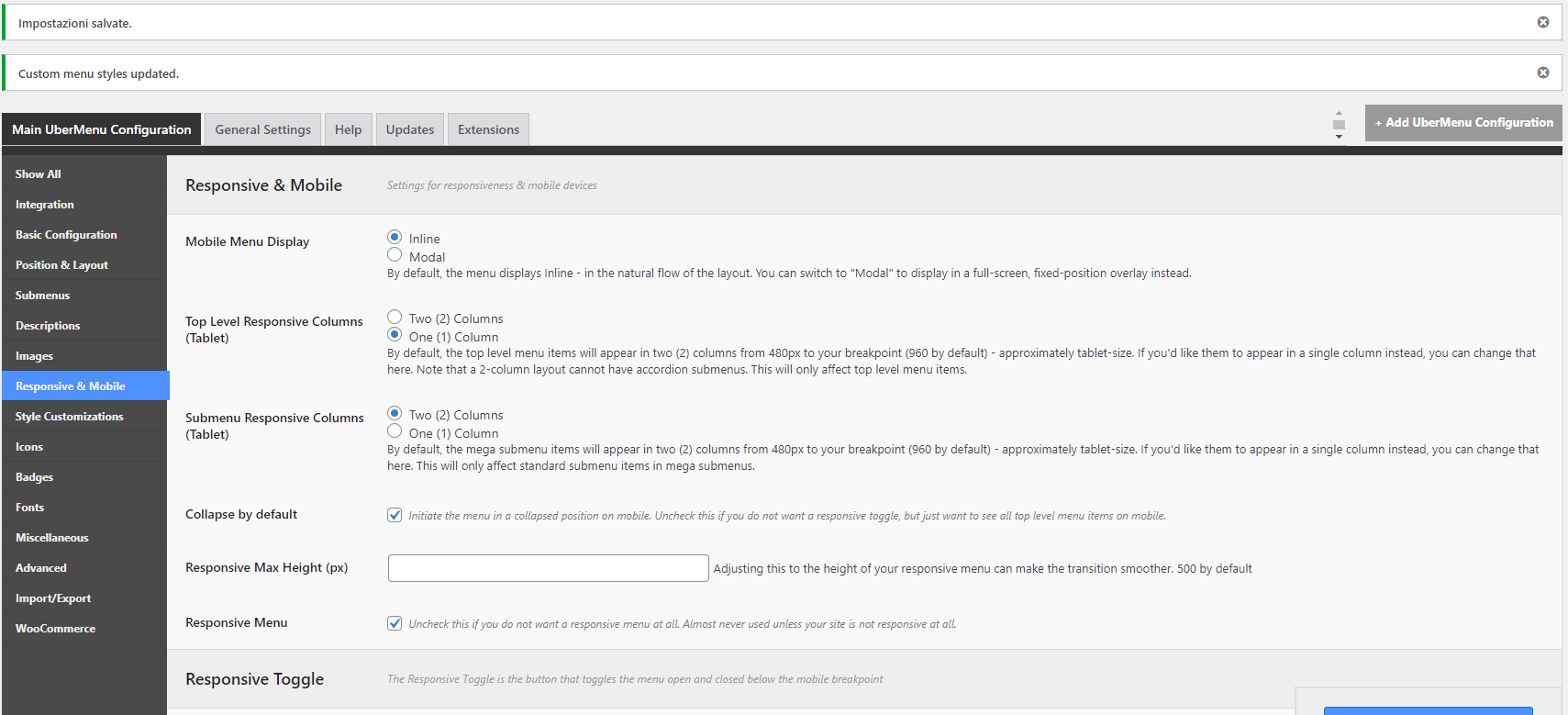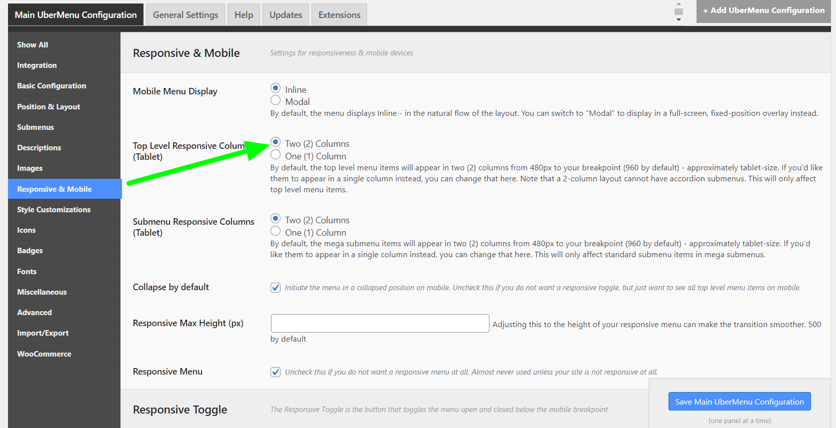 By default, the Top level menu items will appear in 2 columns from 480px to 960px. To make it in One column you need to select Main UberMenu Configuration > Responsive & Mobile > Top Level Responsive Columns as shown in the given screenshot.