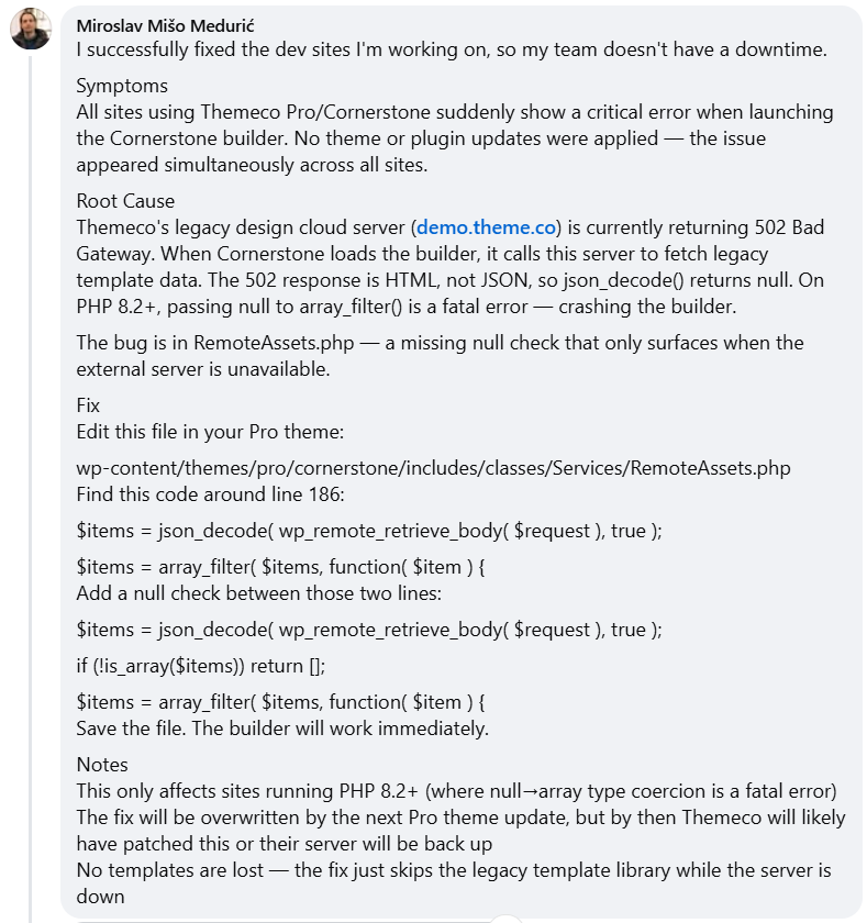 I can confirm this fix has worked for me too. I’m surprised Theme Co have’t weighed in on this after 3 hours? Not even a quick message to say they are aware of the issue and are trying to resolve it?