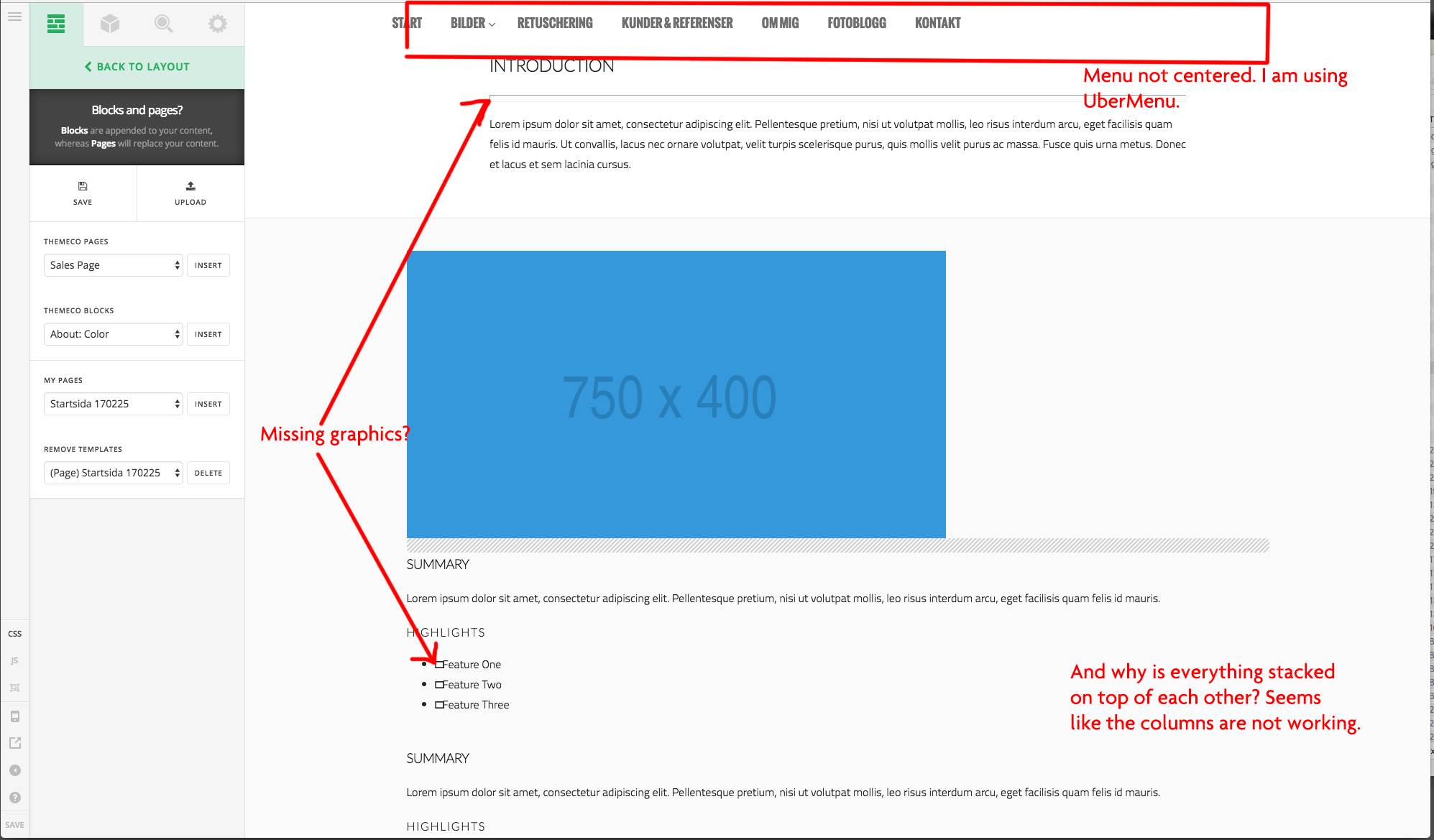 CSS seems to be working pretty bad, everything listed on top of each other. No settings like hide section based on screenwidth works. Columns don’t work.