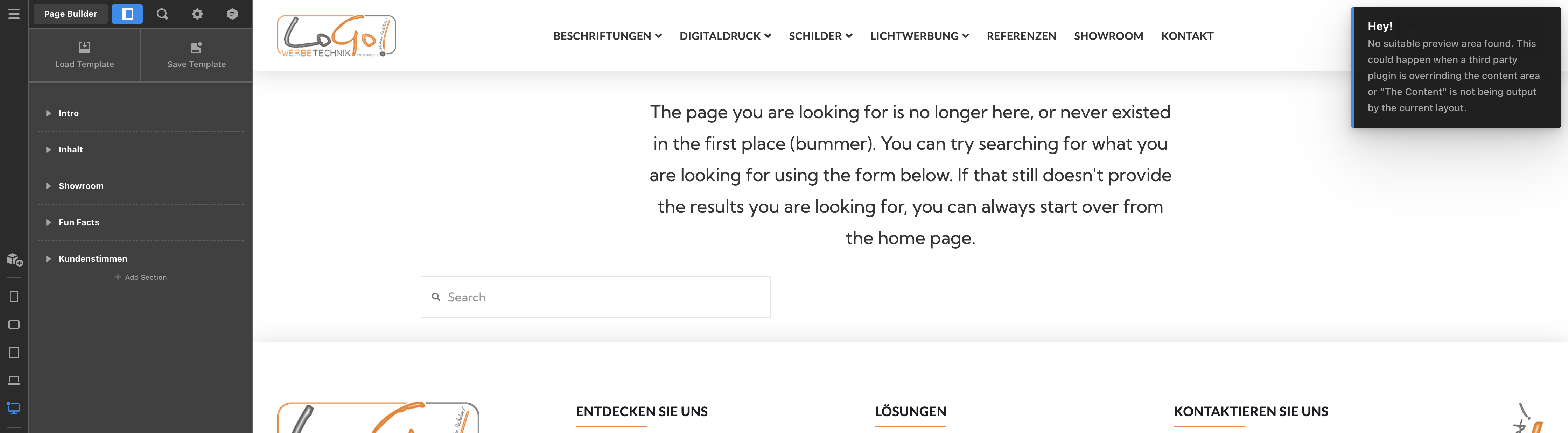 “No suitable preview area found. This could happen when a third party plugin is overrinding the content area.”